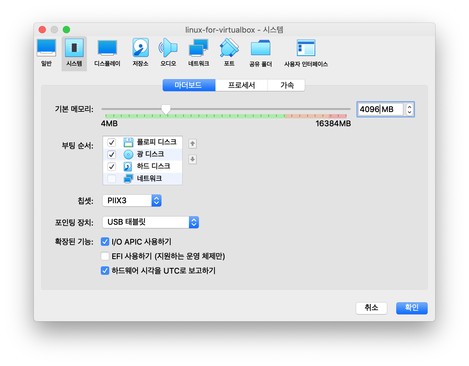 나중에 너무 느려서 못쓸거 같애.. 라고 느낀다면 최소 프로세스 2개에 Memory 4GB 정도로 늘려주자^^ (GUI 들어가면 이정도는 최소한 줘야 한다.)
